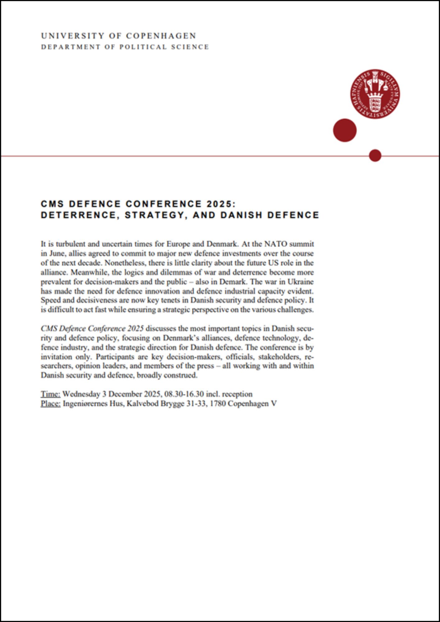 CMS Defence Conference 2025 focused on some of the most important issues in Danish defence and security policy at the moment. The conference brought together decision-makers, stakeholders, journalists and researchers from the broad defence and security policy community in Denmark to discuss alliances, defence technology, the defence industry and the strategic direction of Danish defence. The conference was held on 3 December 2025 in Copenhagen.